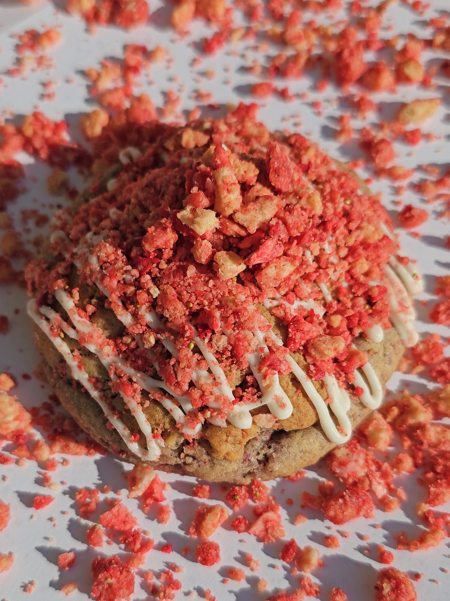 Experience the perfection of organic freeze-dried strawberries blended into a soft, thick cookie, elegantly drizzled with premium white chocolate. Topped off with our signature Strawberry Crunch Topping, and every bite just keeps getting better.The sweetest drop of the month has arrived!